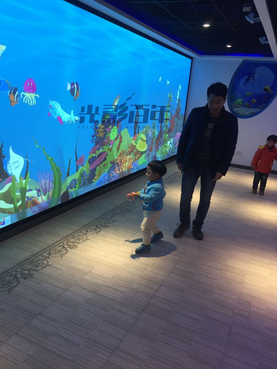 在光影百年虛擬水族館,只要在畫紙上畫下小魚,它既可以色彩斑斕,也可以表情豐富,無論創意多么夸張,通過特制的掃描系統后,參與者的作品會融入水族館與其他的魚兒共同游耍。全幅水族館環繞會場,通過體感技術提供參與者與自己的魚兒及場景設定進行親密互動:輕拍魚兒可以魚兒互動玩耍;輕拍掉下的特殊寶藏,可以讓餓肚子的魚兒飽食一餐。