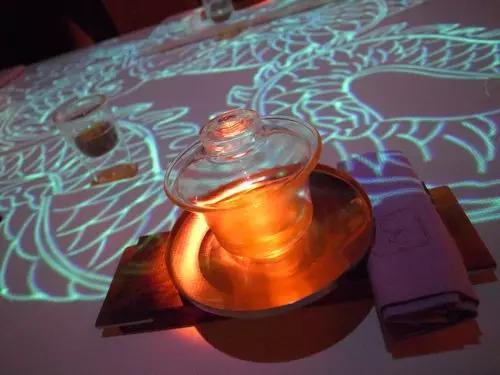 而中國風的「甜蜜蜜」這道菜,則空氣中彌漫著桃子的香氣,餐廳變成了大紅色的中國風,墻上打起了大紅燈籠高高掛的投影,桌上則是中國龍的圖騰,鄧麗君的「甜蜜蜜」回蕩在空氣中,一道番茄白桃露上桌,口感清香。