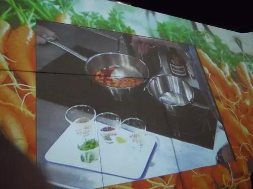 甜品「CarrotCake, Coriander Orange Cream Cheese」則是香橙和姜汁制成的「胡蘿卜蛋糕」和「香菜橙奶油奶酪」,這時候,四個墻面變成了胡蘿卜的天堂,耳邊洋溢著快樂的樂曲。一個現場的視頻投射到墻上,視頻中,主廚 Paul Pairet 正在制作,拍攝方式就像是電視里的廚藝節目,而且它是live(現場)的!這時候,所有通向廚房的門打開了,我們可以進去神秘的廚房!