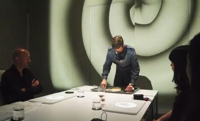 這不像餐廳,卻是一個類似「駭客帝國」電影里的科幻實驗室,「純白色,未來感」是首先蹦入我腦海的兩個詞。位于這個高聳白色空間的正中央,是一種類似「會議室」的擺設——一個巨大的白色長桌和10張白色工作椅。頭頂上,是多部投影機和鎂光燈組成的,空氣中散發著某些未知香料的味道,這一切,都活似一個拍攝未來風格電影的制片廠。