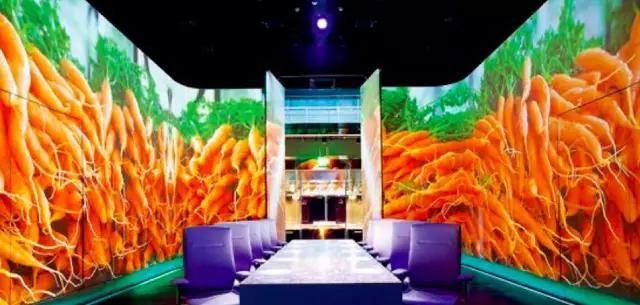 光影把我們的名字投影到了餐桌上,我們按照指示坐下來。燈光漸暗,好戲即將上演。然后,讓所有人大開眼界的一刻出現了——四面墻上的大屏幕突然亮起。