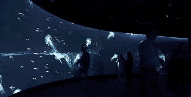 沉浸式海灣溪流體驗使用專門開發的計算機算法來展示成千上萬的虛擬沙丁魚和其他海洋生物的現實和不斷變化的教育行為。借助攝像頭跟蹤傳感器,使參觀者可以實時影響超高清流動環境,這類似于游獵或水肺潛水。