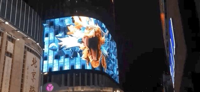 相似的場景也在武漢江漢路步行街的1024平方米LED大屏發生,同樣是和太古里一樣的裸眼3d大屏,也是神秘的太空飛船,行人只需要抬頭就能有震撼的視覺體驗,同時在廣州的北京路步行街新大新百貨外墻上,也有一塊1200平方米的L形8K屏幕,現代的科技加上百年的建筑又會碰撞出什么樣的視覺效果,巨龍從墻中飛躍而出,逼真效果引得行人感嘆。