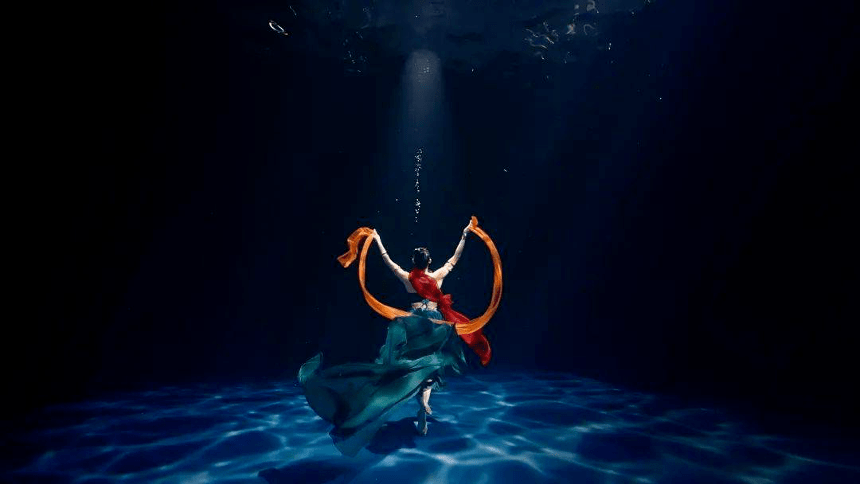而這份拍案叫絕的創意雖然呈現效果很好,但是背地里的付出也是非常艱辛的,據《祈》的編導郭吉勇說,這個節目在拍攝時,工作人員在水下泡了將近26個小時,舞者不僅要面臨長期在水下可能造成的失溫、耳壓等風險,還要控制好面部表情和眼睛等微動作,經歷了三次拍攝,最終才拍出這絕美的水下舞蹈,