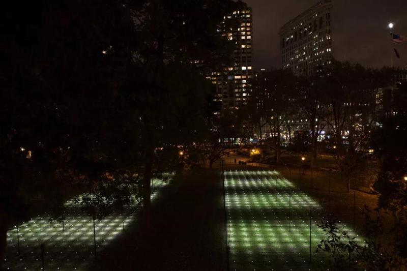 燈泡球隨著周圍的環境狀況隨意擺動,在地面上產生不同的圖案樣式。當你的喜怒哀樂被投射在寬闊的綠地上時,一種豁然明朗的釋放感讓這片存于喧囂城市中的“治愈”作品饒有意味。