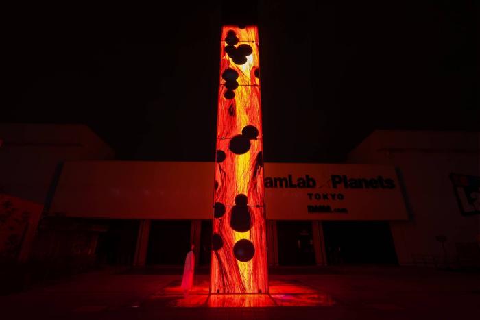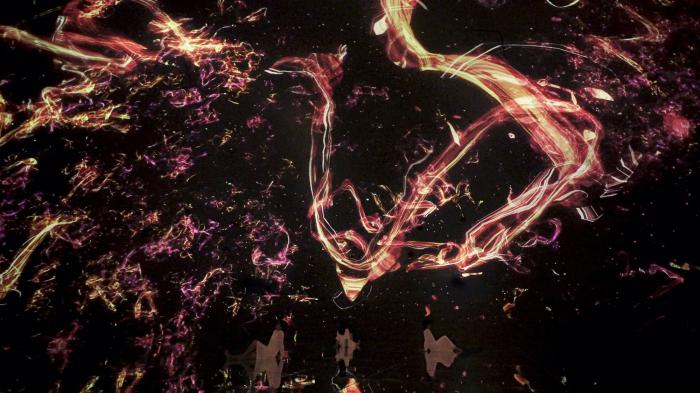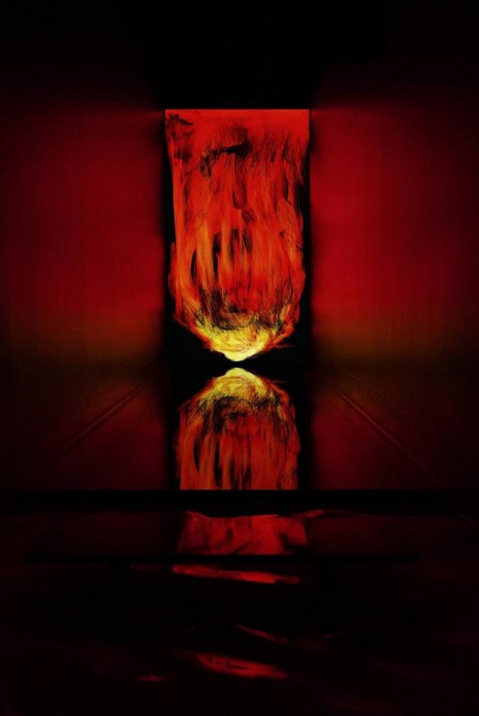 火焰是由于燃燒而產生的一種光和熱的現象,并非是一種物質,而是我們看到燃燒這種化學反應時的感官體驗。 這種感官上的體驗,使得火焰能夠被我們認知為是一種物體,且有時能夠在其中感受到生命的存在。氣體燃燒所產生的分子的運動軌跡在空間中描畫出線條,這些線的集合便構成了火焰。 該作品是根據teamLab的 “超主體空間 “概念,將線條的集合體進行平面化地表達而創作的火焰。火焰的形狀會隨著絕對的黑色的形態而發生變化。