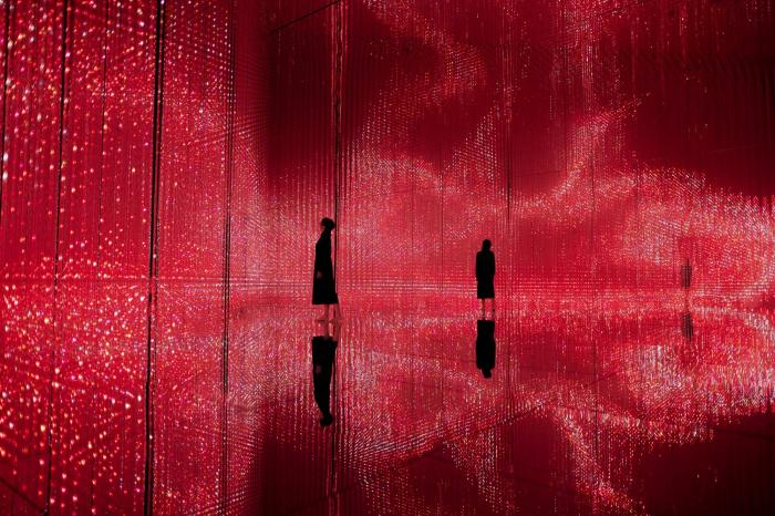 “空書”在無限的空間里永遠重復書寫著。如果在此處或躺著或坐著停留一會兒,或許不久你會感到身體漂浮了起來,并與世界融為了一體?!皶钡拿恳粋€文字都擁有其獨特的聲音。當你靠近“書”時,它的聲音也會越來越近。“空書”是teamLab從創立以來一直延續的,在空間里書寫的書法。書法特有的墨跡,深淺度、速度和力度,在全新詮釋的空間里被立體的再構建,通過teamLab的“超主觀空間”的理論結構被二次元化。書法在平面和立體之間不斷巡回。