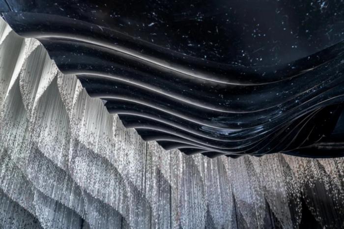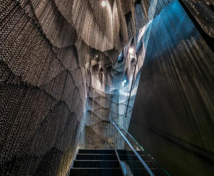 首先,是一座14米高的黑灰色大理石樓梯間,連接了地下室和每層住宅;這是日本著名建筑師隈研吾設(shè)計(jì)的鏈簾裝置,當(dāng)游客上、下樓時就會發(fā)現(xiàn)鏈簾的顏色就會從淺色到深藍(lán)色過渡,直至地下室變成黑色;反之則向淺色漸變,鏈簾就像龍背上的龍鱗一樣,光影流動。