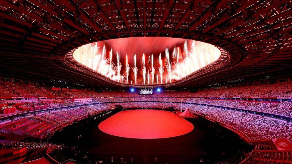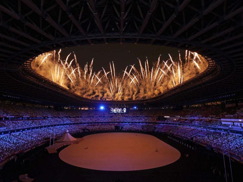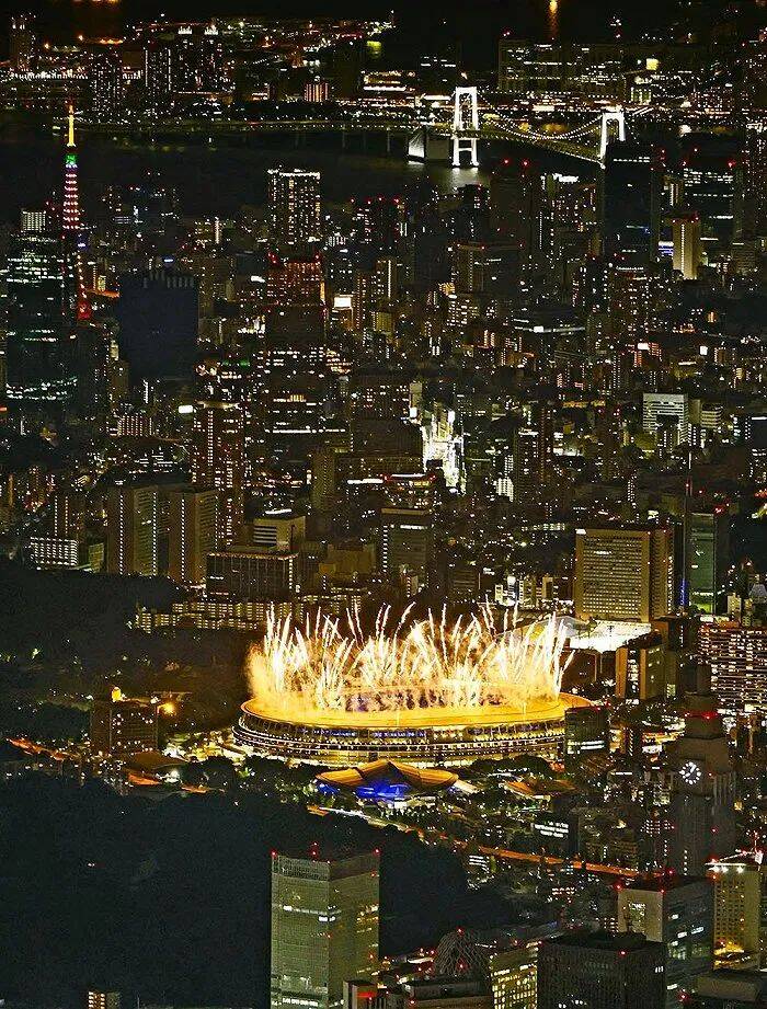 航拍東京奧運會開幕式,煙花在體育場上空飛舞