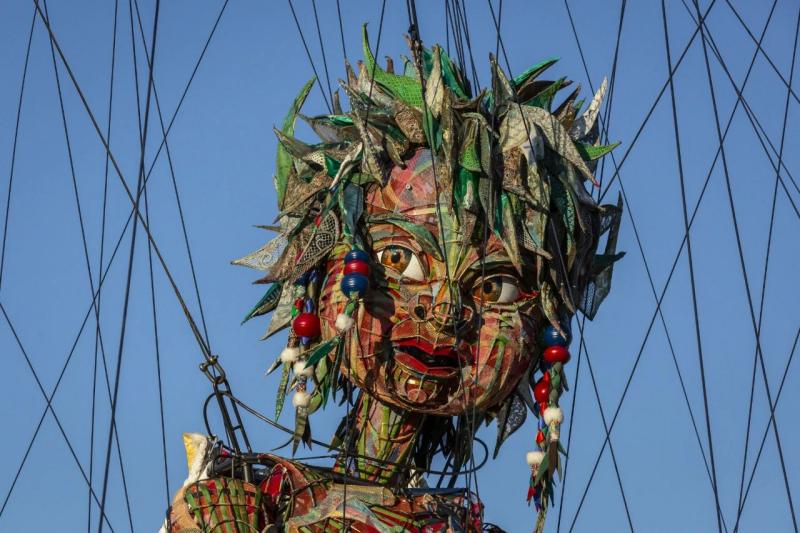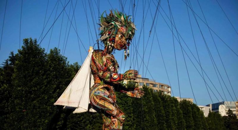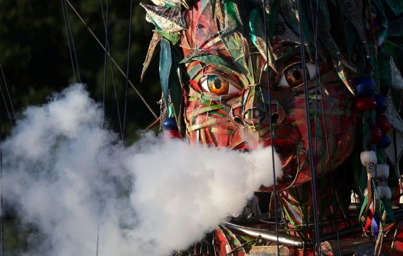 東京奧運會藝術(shù)展覽“搬運幸福之旅”在新宿開展。藝術(shù)家箭內(nèi)道彥設(shè)計的木偶“MOCCO”是以日本三縣災(zāi)區(qū)小朋友的繪畫為原型,使用竹子等材料制成。高10米、重1噸的“MOCCO”形同小巨人,在數(shù)十位工人配合機械的牽線操作下,他可以行走、轉(zhuǎn)動眼珠,嘴中還可以吐出霧氣。
