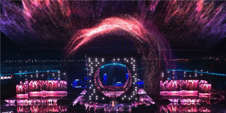 當大銀幕的影像配合現場表演而變幻,同樣超酷的燈光矩陣升降與激光光束表演、以及“科技質感化”亮起的碎片燈框,鏤空設計、煙霧系統等創意藝術運用,將整個舞臺打造成一個穿透性的超時空立體畫面。