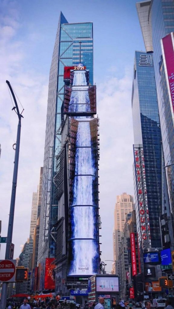 美國(guó)紐約市時(shí)代廣場(chǎng)被稱(chēng)為“世界的十字路口”,這里匯聚了近40家商場(chǎng)和劇院,大量耀眼的霓虹光管廣告、以及電視式的宣傳版,高樓林立上百多塊戶(hù)外屏幕組成高樓的外壁,最近韓國(guó)的數(shù)字媒體藝術(shù)團(tuán)隊(duì)d’strict旗下的團(tuán)隊(duì)a’strict在紐約時(shí)代廣場(chǎng)帶來(lái)了最新裸眼3D作品:《Waterfall – NYC》。
