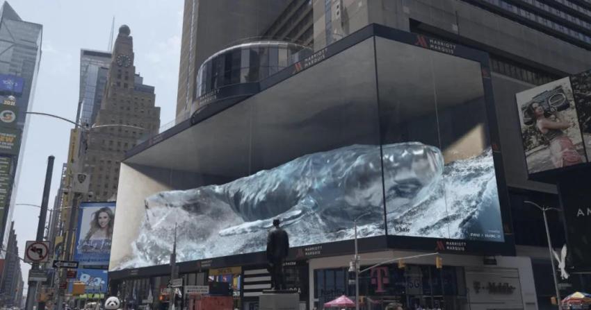 此外在紐約時(shí)代廣場(chǎng)萬(wàn)豪酒店外的大屏幕上,a’strict團(tuán)隊(duì)的另一個(gè)作品《Whale #2》也值得一提,該作品延續(xù)了d’strict的作品Wave的風(fēng)格,以海浪奔涌直擊觀眾的視覺(jué),這件作品占據(jù)了萬(wàn)豪酒店外立面1400平方米的大屏幕空間,翻滾的海浪一下一下的沖擊著,忽然一頭藍(lán)鯨從海浪中躍出,本就不翻涌的海水瞬間愈發(fā)洶涌,急速的拍打、沖擊著,好似下一秒就要涌出屏幕一頃而下,這頭藍(lán)鯨就在紐約時(shí)代廣場(chǎng)掀起了巨大的海浪。