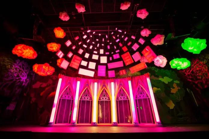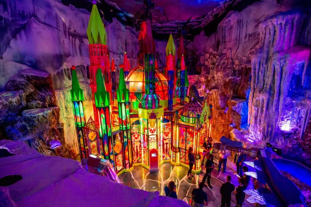 緊接著,游客來到一座33英尺高的哥特式“大教堂”“Eenia”前,通過數字創意影像打造的彩色玻璃花窗讓你置身于七彩萬花筒中;打開這個教堂的大門,仿佛穿越回到14世紀的歐洲世界。