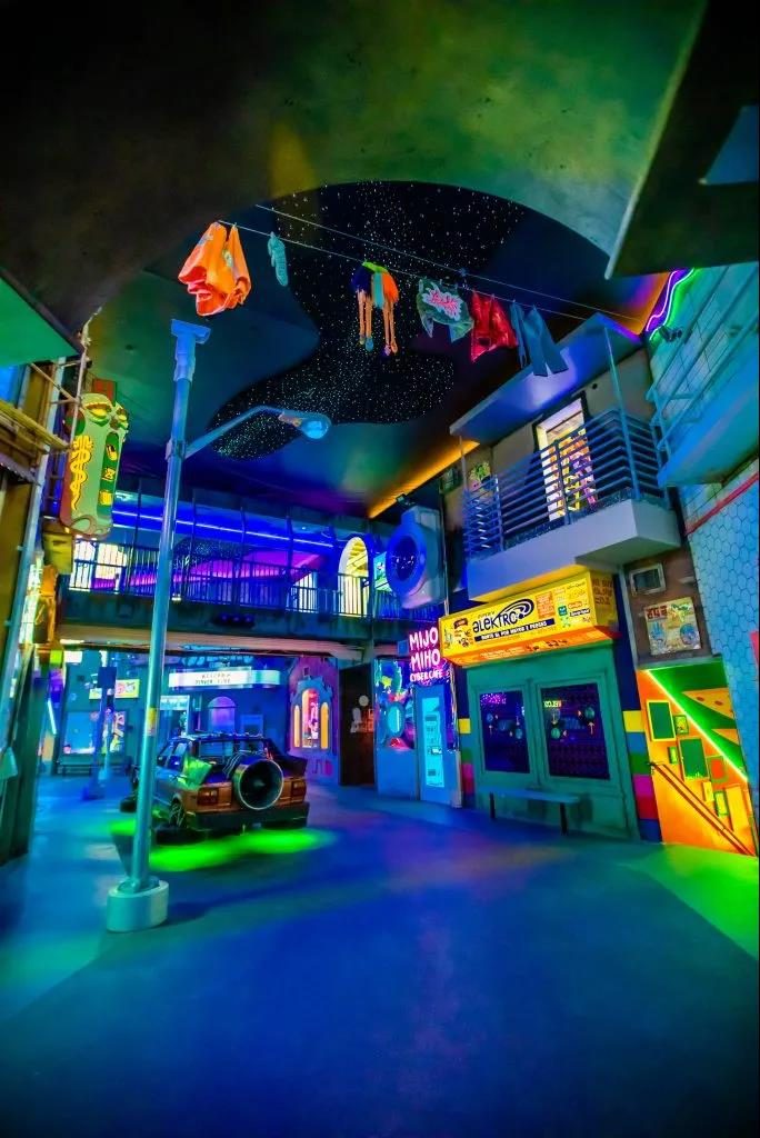 復古的街道,林立的霓虹燈藝術燈光,鮮亮迷人的互動裝飾墻,喚起了一些模糊的過去和未來的記憶,讓人聯想到風格化的東京或洛杉磯。