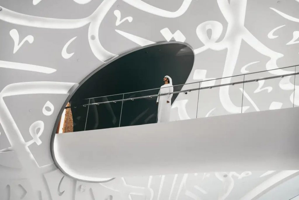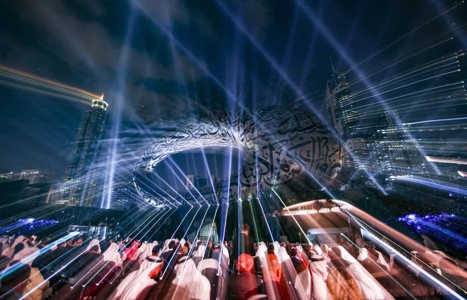 整個場館的外立面由在機器人輔助,結合3D 打印技術建設完成,外觀均是曲面,由 1024 多個寬度最大3米,高度9米單獨的阻燃復合板無縫組成,錯綜復雜的阿拉伯文字詩歌被印在建筑表層,表達了對未來發展的美好愿景,整博物館由三部分組成:環形建筑、鏤空部分、綠色山丘;分別代表了人類、未來和生物的多樣性,形狀各異而不重復的面板上覆蓋著約七千塊玻璃可以保證室內白天的光線充足,晚上這些窗口隱藏著14公里的LED燈將會點亮這個城市。