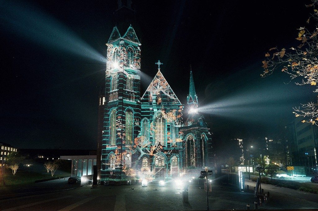 由藝術家Yann Nguema創作,在2021年埃因霍溫音樂節上,《Domus Luma》建筑投影秀在 Domusdela 教堂放映,這是專門為荷蘭埃因霍溫的奧古斯丁教堂編寫和創建的《Domus Luma》項目是在此之前5年啟動的研究過程的一部分。它旨在探索建筑制圖領域的新建議。在規定的范圍內對寶石進行校準。它結合了投影、光影和激光,追求創新和詩意的敘事。教堂立面的 50,000 塊石頭的線條、曲線和體積已盡可能接近地繪制,以使投影與現實融為一體。所有動畫都是由Yann Nguema開發的定制軟件生成的,允許以完全獨特的方式安裝數字結構。光和激光的附加使用完成了投影,提供了一個發光的調色板,更新了傳統映射的美感。