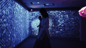 在流體墻上觸摸投射在墻上五顏六色的液體時,顏色開始混合,并從中創造出各色的水母。