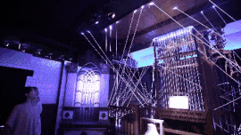 此外,還有一個高達9m的宏偉鐘琴裝置。當你走進觸發裝置時,一場鐘琴與燈光的大秀將精彩上演,在光影中古樸、沉穩、大氣。