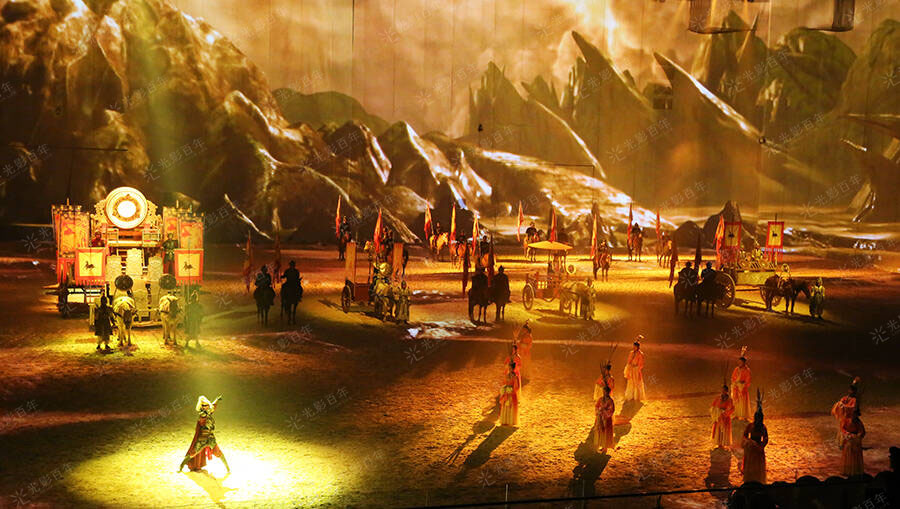 該劇分為《以塵入馬》《雪飔滹沱》《秋牧賽歌》《鏖戰(zhàn)殤祭》《飛馬巡城》五幕。當(dāng)環(huán)境光慢慢暗下,我們仿佛回到一座古戰(zhàn)場上,金戈鐵馬就在眼前和身邊浮現(xiàn),親身經(jīng)歷一個(gè)動(dòng)人的故事傳說。在萬馬奔騰的歷史波濤中,感受飛馬天音,大美滹沱、中國馬魂。