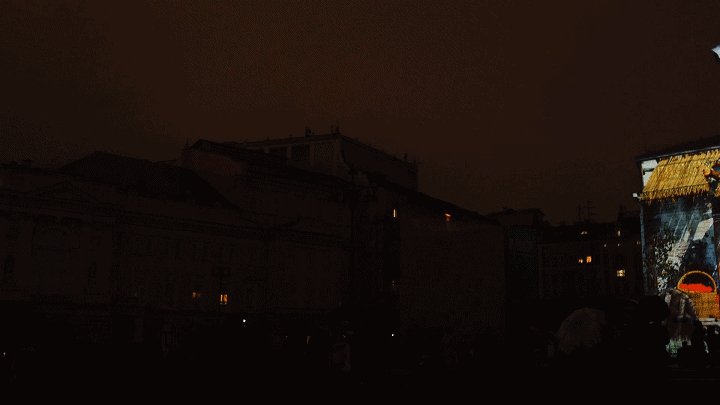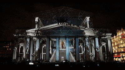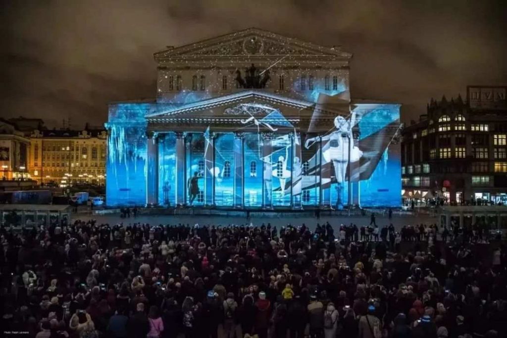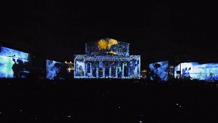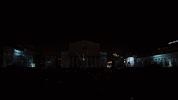 BESTEREO團(tuán)隊(duì)以莫斯科的劇院廣場為中心,將大劇院、瑪麗劇院和青年學(xué)術(shù)劇院的古典建筑立面統(tǒng)一作為投影舞臺,觀影角度達(dá)到270度。