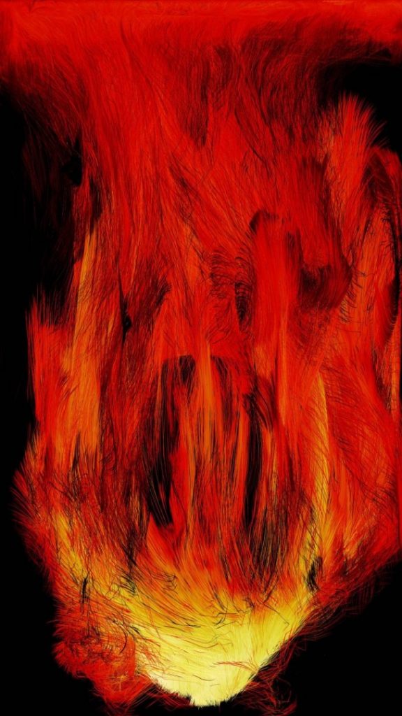 火焰的形狀會隨著絕對的黑色的形態而發生變化。火焰是由于燃燒而產生的一種光和熱的現象,并非是一種物質,而是我們看到燃燒這種化學反應時的感官體驗。 這種感官上的體驗,使得火焰能夠被我們認知為是一種物體,且有時能夠在其中感受到生命的存在。氣體燃燒所產生的分子的運動軌跡在空間中描畫出線條,這些線的集合便構成了火焰。 該作品是根據teamLab的 “超主體空間 “概念,將線條的集合體進行平面化地表達而創作的火焰。