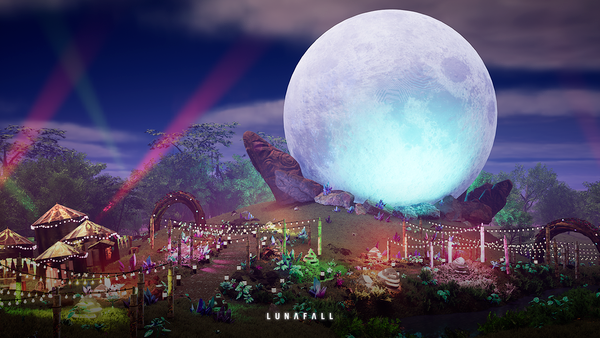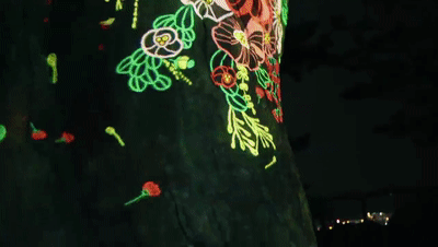 在黑暗的廣場中,伴隨著巨大的月亮,故事開始了,在沉浸式互動的月球下許愿,并隨著移動的步伐,腳下的花朵不斷發生變化、出現發光的花朵和其他圖案。
