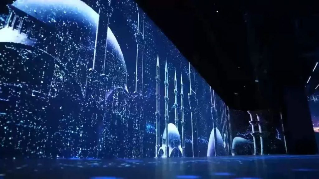 在制作過程中,團隊以藍色和黑色背景的拍攝,帶來超大尺寸的 2D 和3D 動畫。其中,數(shù)字投影和LED屏幕覆蓋了所有的地板和墻壁。