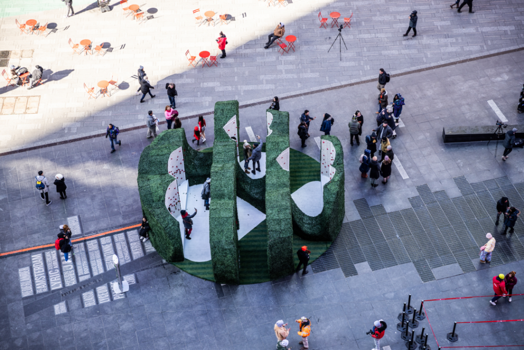 2023年2月2日,愛在時代廣場綻放,邀請游客沉浸在愛情中。今年的獲獎者,創造了一個由四個人造樹籬組成的交互裝置,形成了心形迷宮。