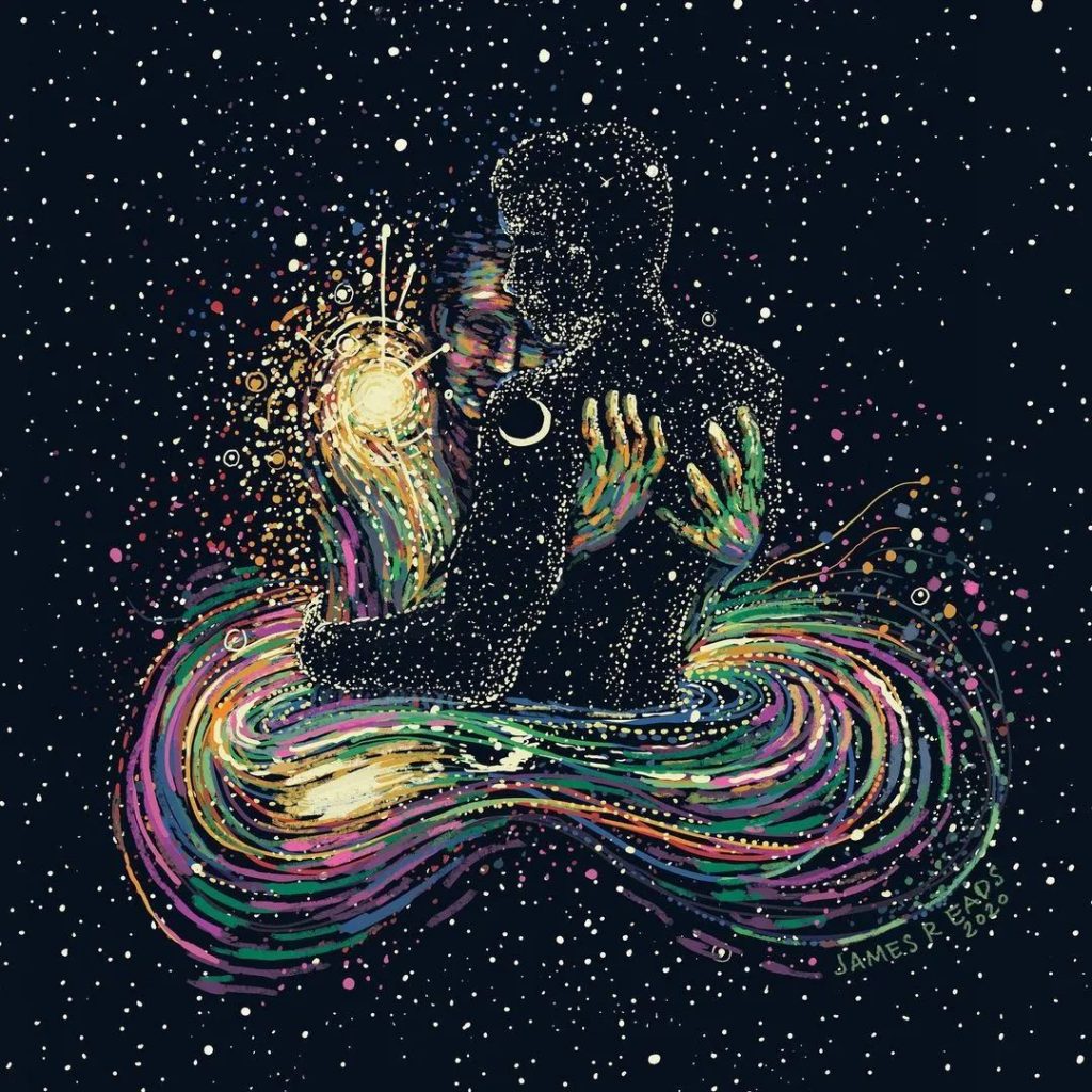 他將自己描述為一個多學科的藝術家,藝術愛好者。在他的筆下,描繪人與自然的關系,并且參考了梵高的色彩使用方式,用流動感的筆觸,旋轉的點點星光,螺旋式的排列,用五彩繽紛的點和線,交錯纏繞,富有沖擊的夢幻旖旎的畫感仿佛聯接現在和不同緯度世界的時空門。