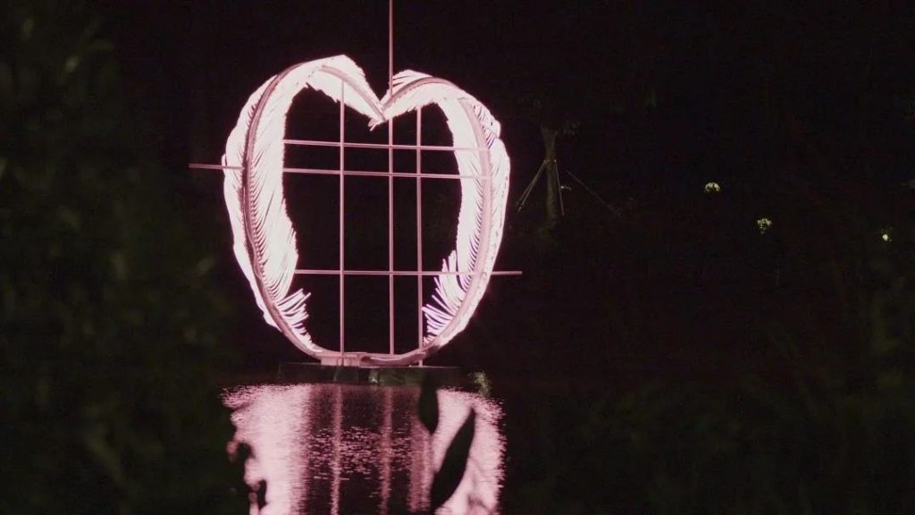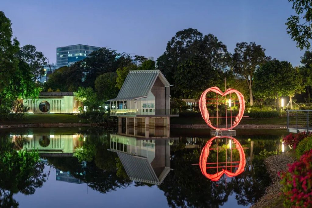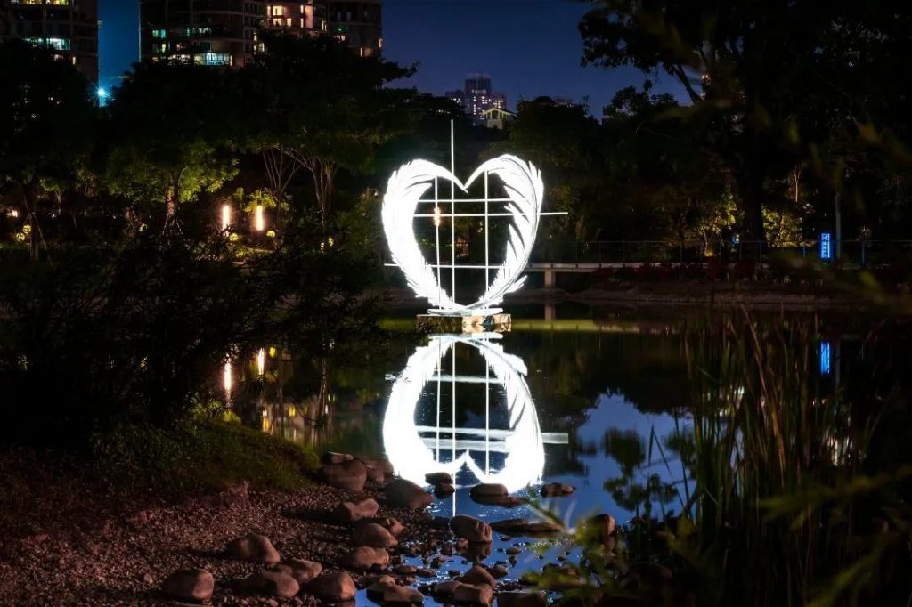 2022深圳光影藝術季展出的數字藝術作品《比翼·心》,用絕美的光影藝術,繪出了愛情的純潔無瑕,也映照出戀人心底的婉轉纏綿。在水平如鏡的湖面上,《比翼·心》和周邊景致自然和諧。