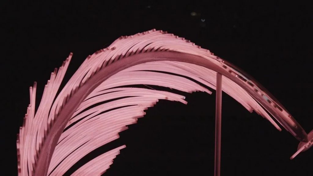 遠遠望去,兩片象征飛鳥的羽毛在空中飄蕩,微風拂過,便翩翩降落到波光蕩漾的湖面上交叉相擁,形成一個“心”形的空間形態。