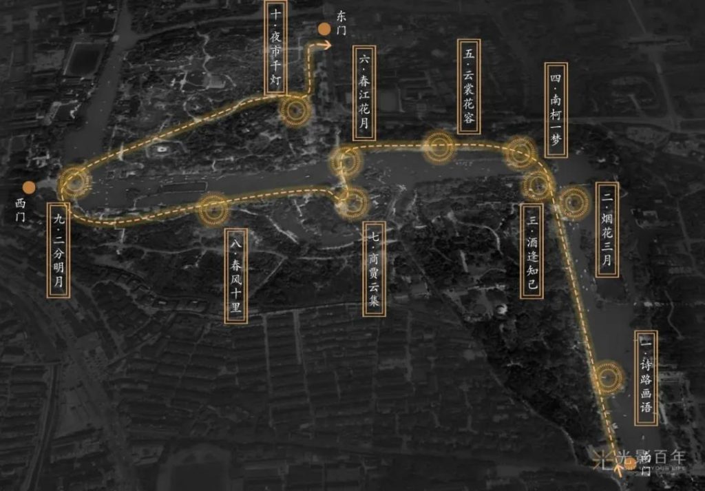 其中包含光影詩畫夜游,交互場景體驗,花車花船巡游,千燈夜市四大核心板塊。將整場夜游活動劃分為“煙花三月”“春江花月”“商賈云集”“春風十里”“二分明月”等十大篇章。