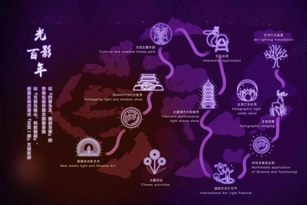 光影百年將創意、科技、藝術與文化相結合,通過光影、影像、交互、演藝、造景等,打造沉浸式環境,融合真實與虛擬、自然與數字,激發一系列好奇及鏈接關系,實現視聽有沖擊、身體有互動、情感有共鳴,創造難忘的數字創意文化體驗。