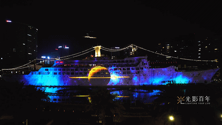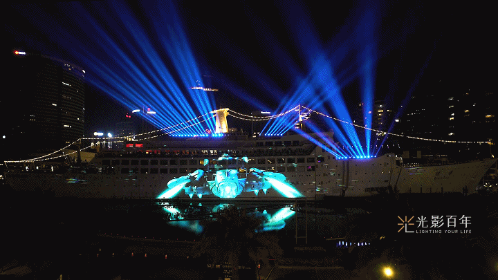 國內首創170米超大型輪船體3DMapping燈光光影秀—《未來之光》由光影百年作為此次作品的總策劃團隊之一成功打造。通過各種新型燈光技術,實現燈光場景化,作品包含極其魔幻的燈光前秀、激光秀及震撼無比的3D MAPPING光影秀。