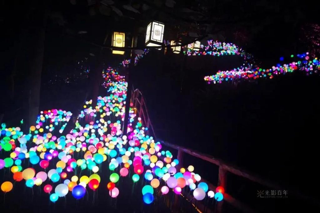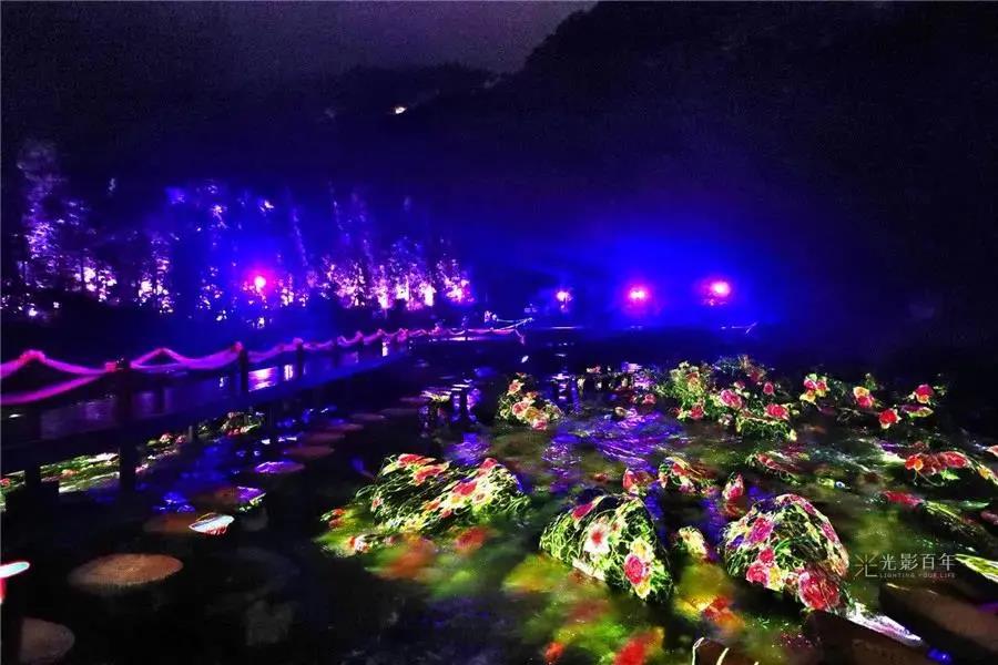 游客在夜色中徒步行走在山林河流上時,可以感受著飛龍作惡下的3D MAPPING城堡光影秀;布滿藝術燈光裝置的避險叢林小路;四郎與惡龍打斗的瀑下全息水幕秀;嫦娥在其中偏偏起舞的崖壁月輪;充滿甜蜜色彩的喊泉約定互動、空中奏樂互動、墻面印證互動等;幸福洋溢的雙生村3D MAPPING光影秀;林間嬉笑的各種趣味交互裝置;螢火漫天的幽幽燈火森林;還有引爆整個項目,極具震撼效果的的原始洞穴沉浸式舞美天眼劇秀。
