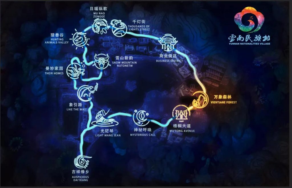 精心提煉出一條長達2.3公里的行浸式夜游動線,在紛紛蘇醒的圖騰神獸帶領下,去探秘6大民族主題區、交織3場特色文化演藝大秀、體驗9大互動項目、沉浸16處光影藝術節點,還更有還原當地煙火氣息的文創體驗街區……