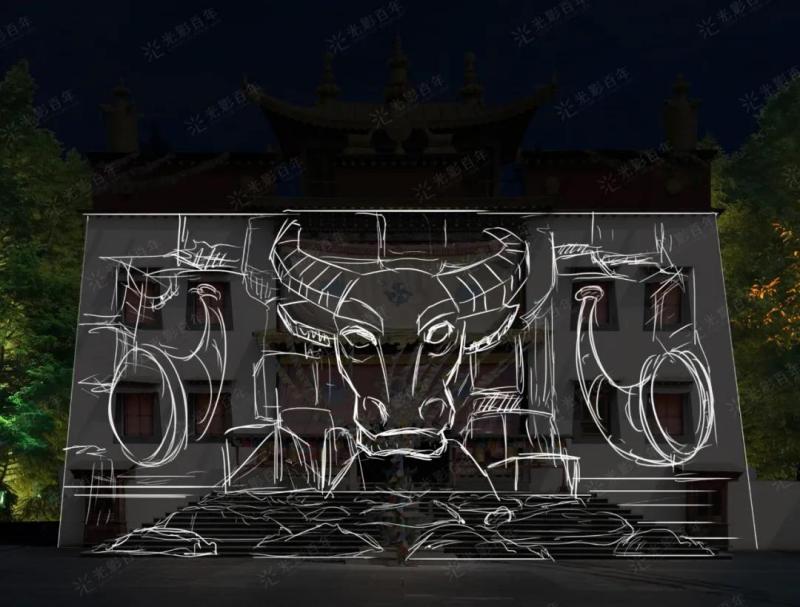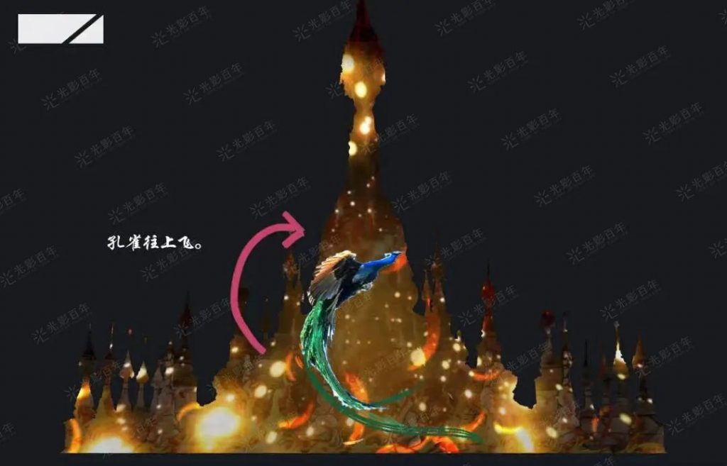 制作過程中的難點,例如像允燕塔,因其塔身復雜的葫蘆縱深結構及其成像面有限的問題,我們除了找準最佳觀影視角,根據塔身,將畫面分成前景、中景、遠景,每一層的場景,在塔身階梯分層,既避免畫面分割又使畫面內容得到最好展示。