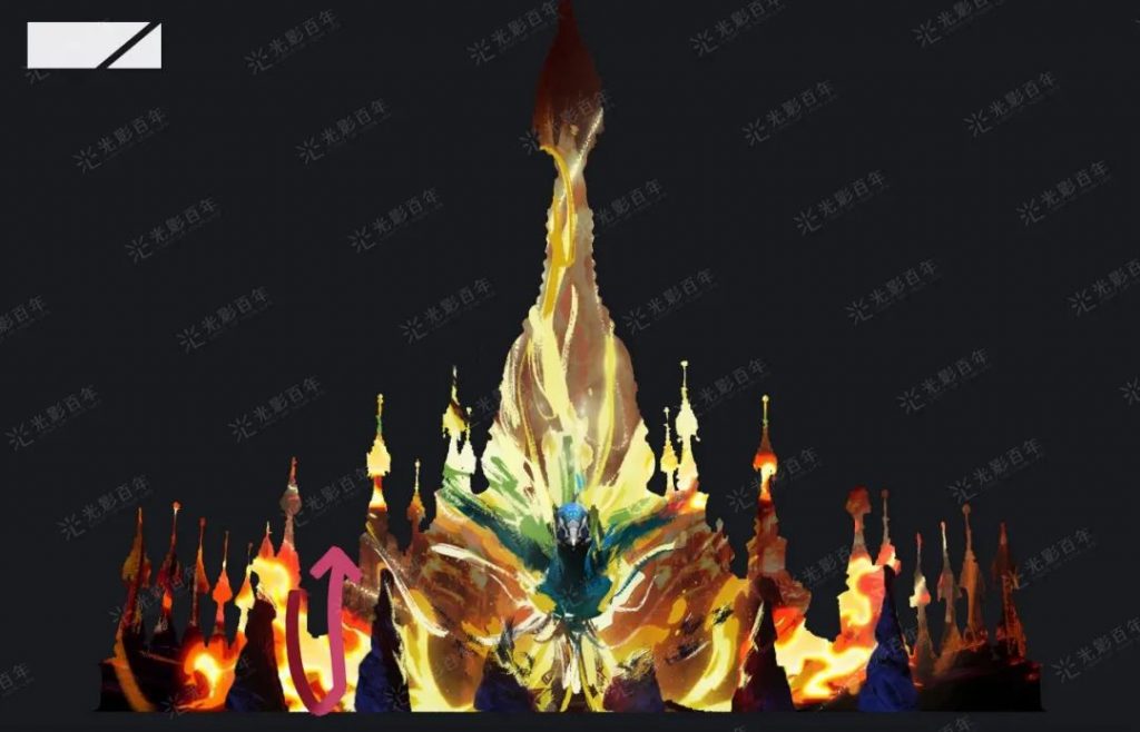 幻火奇妙夜中的3場大秀,我們不像以往設計的3Dmapping結構秀。這三場大秀,我們根據演繹主題,結合舞臺載體,這些載體可能是樓體結構、可能是層次寶塔、也可能是巖壁巨石,設計既需要表達明白整個歷史事件的故事性影視內容,又需要展示極強的裸眼立體視效及舞臺燈光演繹,同時更需要滿足影像內容、燈光演繹與舞蹈演員的聯動互動。并且我們與演員深入交流,灌輸每個肢體動作與整個場景搭配所表達的故事情緒,最終使每場秀都是集合極強的震撼視效、張力演繹、劇情情緒、燈光營造于一體。