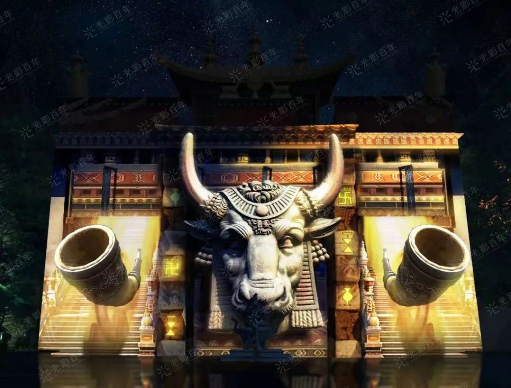 跟隨神獸牦牛的步伐,蒼山之上,漾濞江畔,鐵索橋之戰——唐標鐵柱。這個集合故事線與極強裸眼視效的演繹秀,講述著這座紀功豐碑的故事,也是一場戰爭的遺跡,一段歷史的見證;更是紀念刀光與劍影這短暫插曲的最終,干戈化玉帛才是云南這片大地上永恒的旋律。“樓體互動、許愿神塔、篝火派對…”讓大家感受到恢弘的立柱史記后,感恩于和平時代的團結與快樂。